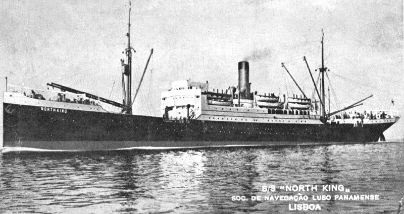 Panama flag pass/cargo liner NORTH KING, imo 2222653/ 119m/ 4.608tb/ 11kn/ pax ??; 06/1903 completed by Bremer Vulkan, Vegesack, as cargo ship LIEBENFELS for DDG Hansa, Bremen; 01/08/1914 she take refuge and was interned at Charleston, SC, due to the outbreak of the WW1, in order to avoid being attacked and sunk by the enemy; 02/1/1917 with the entry of the U.S. in the conflict, she was immediately seized by the Navy after scuttled and sunk by the German crew; 20/03/1917 she was refloated and meanwhile repaired; 06/04/1917 she was converted into naval transport and renamed USS HOUSTON (AK-1) and handed over to the U.S. Department of the Navy , Washington, DC; 23/03/1922 decommissioned; 27/09/1922NORTH KING, Alaska Portland Packers Association, Portland, OR, mgrs Frank M. Warren; 1929 NORTH KING, Pacific American Fisheries Inc., Bellingham, USA, 1940 NORTH KING, Diana Compañia de Vapores SA, Panama; 1941 chartered by War Shipping Administration, mgrs United States Lines, New York; 1947 NORTH KING, Soc Navegação Luso Panamense, Lda, Lisbon, Panama flag, who converted her into pass/cargo liner; 1956 laid up at Lisbon; 01/06/1957 arrived Osaka for breaking up.