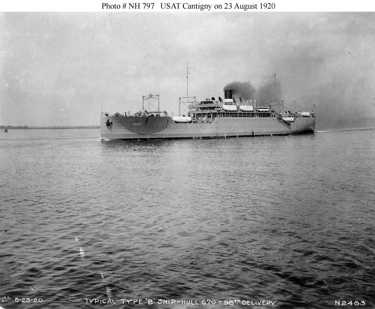 The U.S. Army Transport Cantigny, a 7555 gross ton troopship, was completed at Hog Island, Pennsylvania, in August 1920. She was the second ship of her design (Hog Island Type B) to be laid down (on Armistice Day, 11 November 1918) and the first to be launched. USAT Cantigny made one trooping voyage to Panama and then commenced a series of crossings between New York and Antwerp, Belgium, repatriating American forces from Europe. The Army soon found her surplus to its needs and laid her up, probably following her return to New York from Antwerp in September 1921.